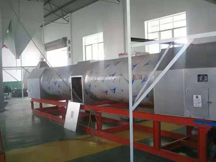 我們解決其技術(shù)問題所采用的技術(shù)方案是:一種新型環(huán)保節(jié)能熱風(fēng)炒爐,由電源供電,包括第一燃燒室、第二燃燒室、熱風(fēng)炒爐滾筒、存料機、自動喂料器、出料機、引風(fēng)機和排潮風(fēng)機,所述熱風(fēng)炒爐滾筒的入口端通過自動喂料器與所述存料斗連通,所述熱風(fēng)炒爐滾筒的入口端還通過風(fēng)道與所述排潮風(fēng)機連通,所述熱風(fēng)炒爐滾筒的出口端與出料機連通,所述第一燃燒室和第二燃燒室通過風(fēng)道與引風(fēng)機連通,所述第一燃燒室和第二燃燒室分別位于所述熱風(fēng)炒爐滾筒的下方,所述熱風(fēng)炒爐滾筒軸心線與水平面形成2°到8°的夾角,所述第一燃燒器和第二燃燒器安裝位置在相應(yīng)燃燒室的前端或者相應(yīng)燃燒室的兩個側(cè)面。我們設(shè)備取消了原熱風(fēng)炒爐所配套的單獨熱風(fēng)爐、彎段風(fēng)道或直段風(fēng)道;在炒爐滾筒下方設(shè)計安裝兩份熱風(fēng)燃燒室,用燃燒器產(chǎn)生的熱風(fēng)直接對滾筒進行加熱,******限度地縮減了炒爐散熱環(huán)節(jié)和面積,從而實現(xiàn)炒爐連段式加熱。與現(xiàn)有設(shè)備相比,我們公司設(shè)備充分利用了熱風(fēng)釋放的熱量,減少了熱量損失,單噸油料或糧食加工消耗添人氣甚至能降低到25nm3,降低了17%,節(jié)能降耗效果非常明顯,得到了客戶的一致好評。與現(xiàn)有設(shè)備相比,同等日加工量,所配兩臺燃燒器合計功率比現(xiàn)有設(shè)備燃燒器功率下降20%-30%,熱風(fēng)設(shè)定溫度有750-800℃下降到400-500℃,明顯延長了炒爐的使用壽命。第一燃燒室和第二燃燒室的功能各不相同,工作溫度也不一致,第一燃燒室和第二燃燒室能夠?qū)崿F(xiàn)分段加熱溫度控制,更加靈活與合理,安全可靠,便于操作與控制。